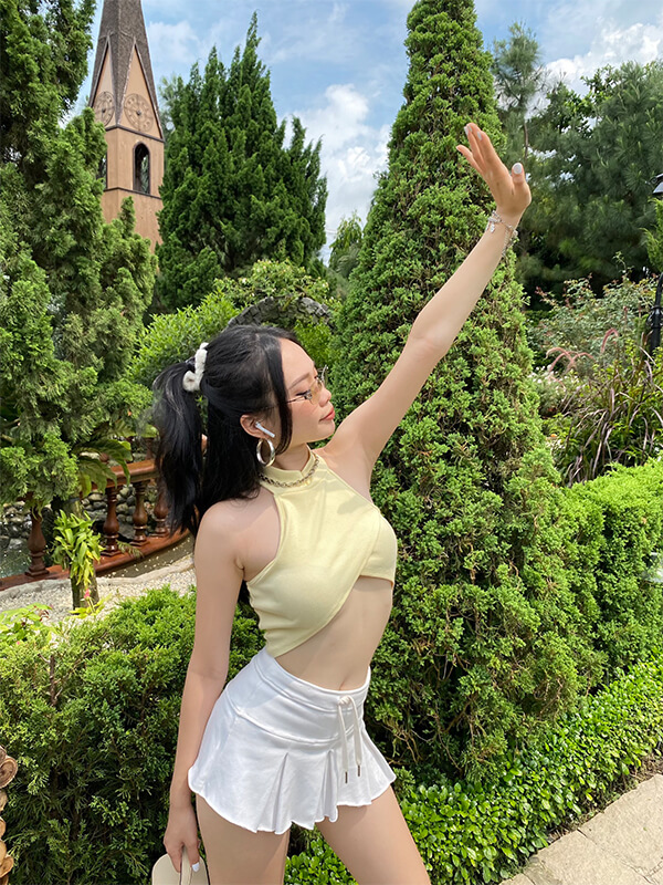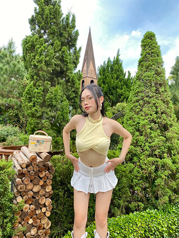 – LEXIMAR CROP thiết kế yếm lạ mắt “kín một chút hở một tí” với chất liệu thun gân dày dặn co giãn tốt có màu vàng baby và hoa nhí so kiu